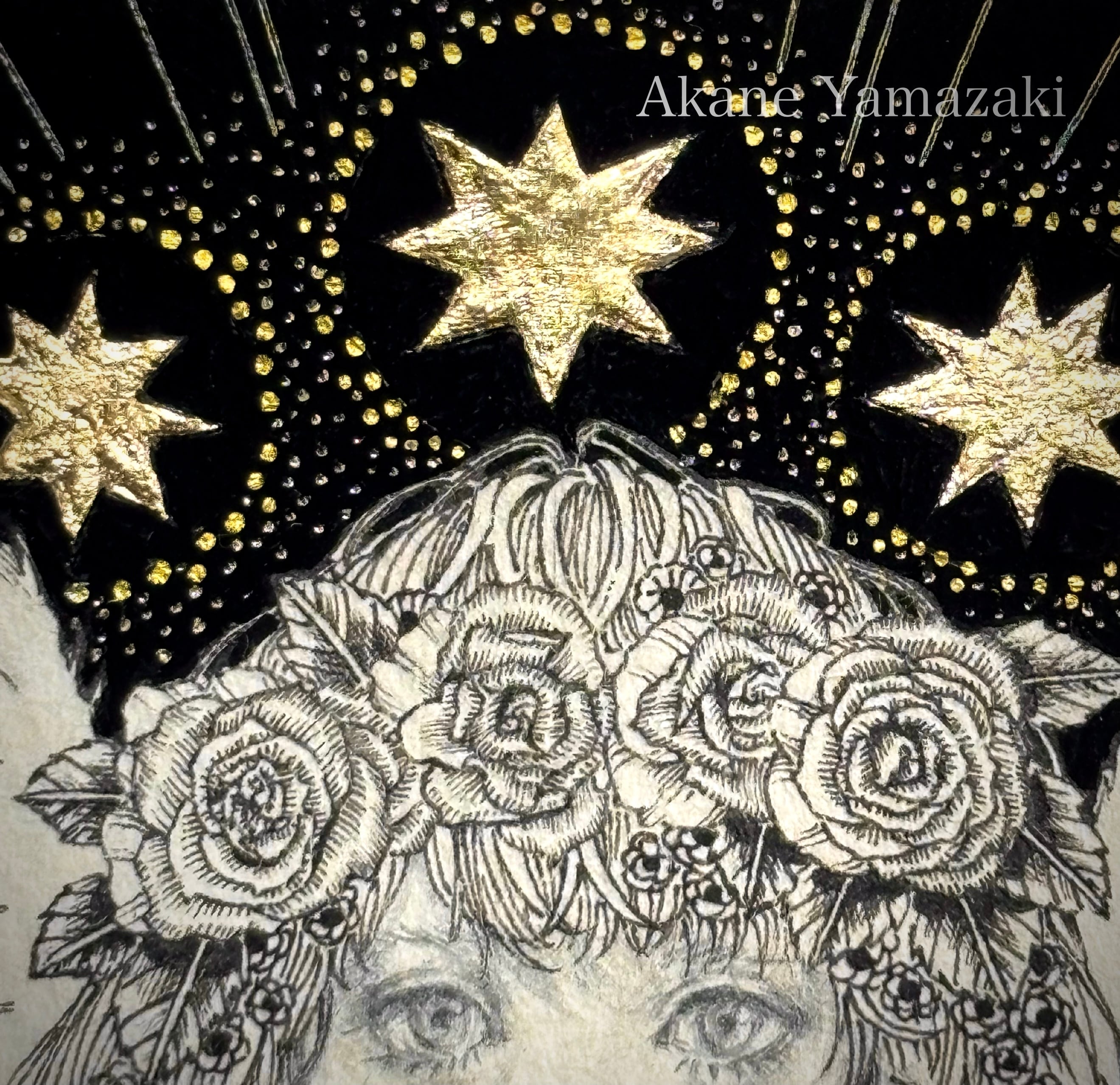 ・ゴールドのペンとホイルフレーク(アルミ製の装飾用箔)を使用した作品なので、角度によって煌めきます。部分的に鉛筆を使用した作品なので、定着の為にフィキサチーフを塗布しています。