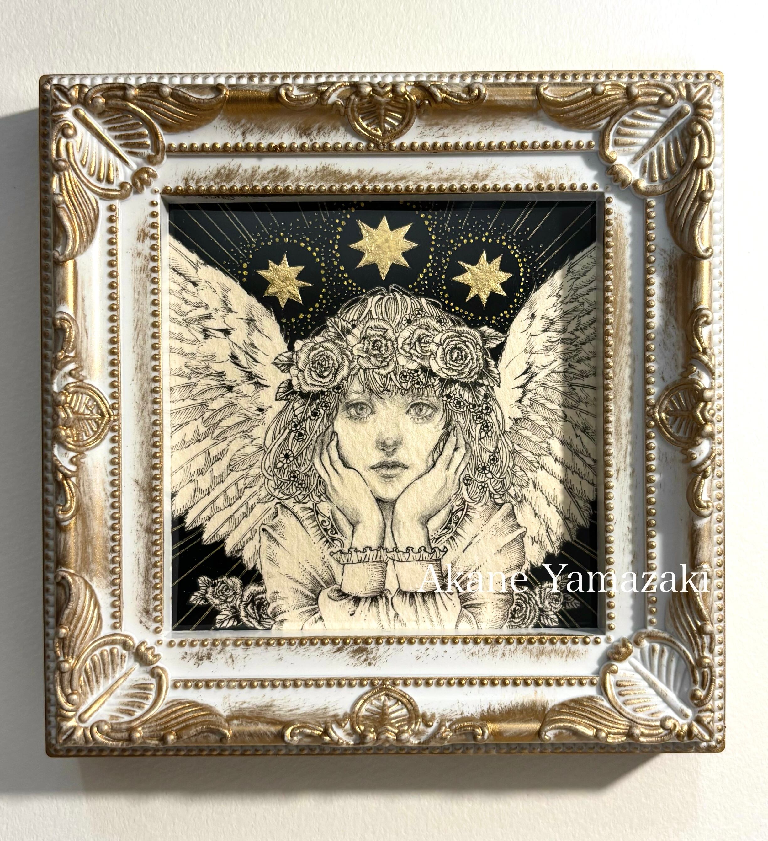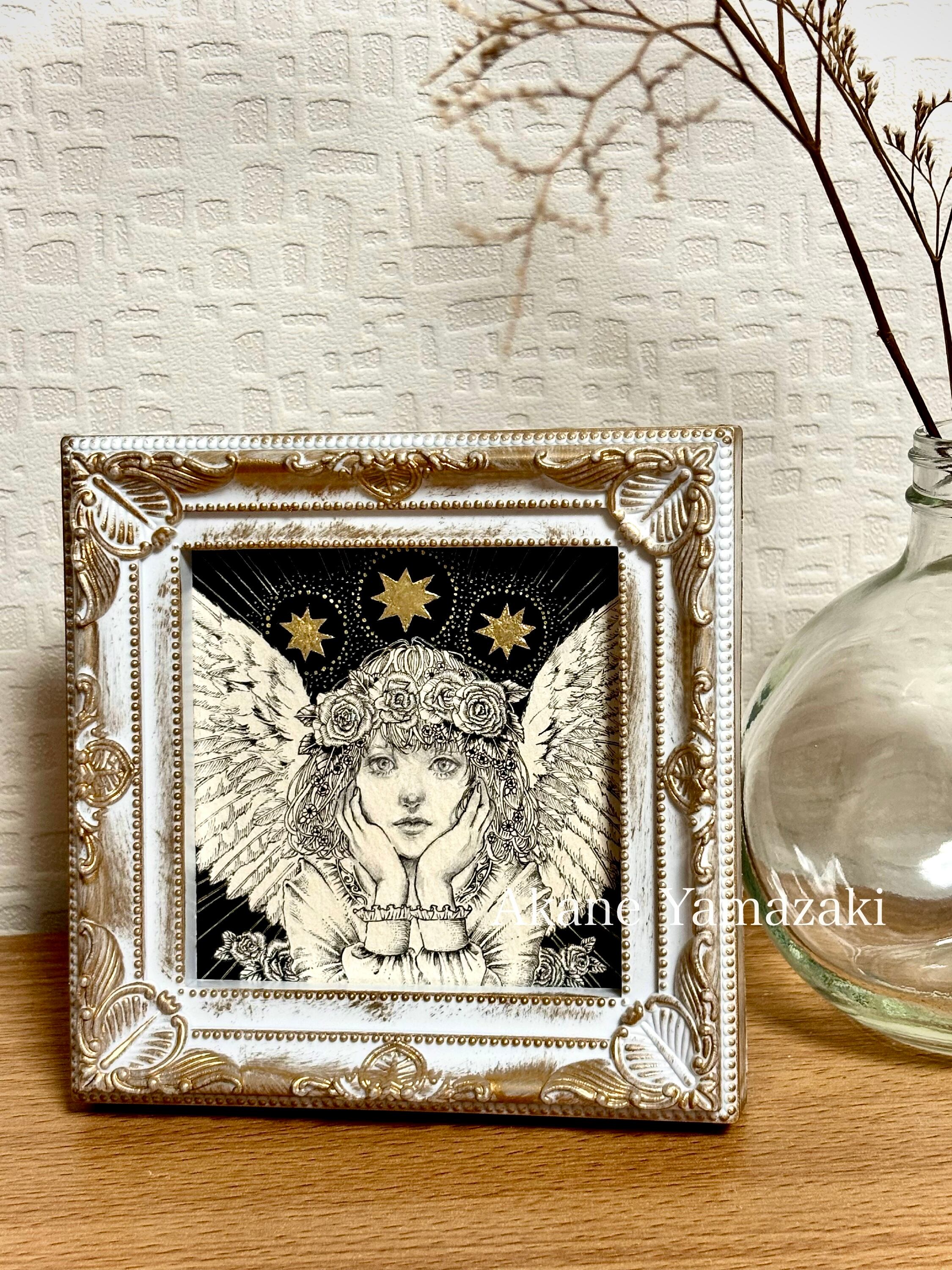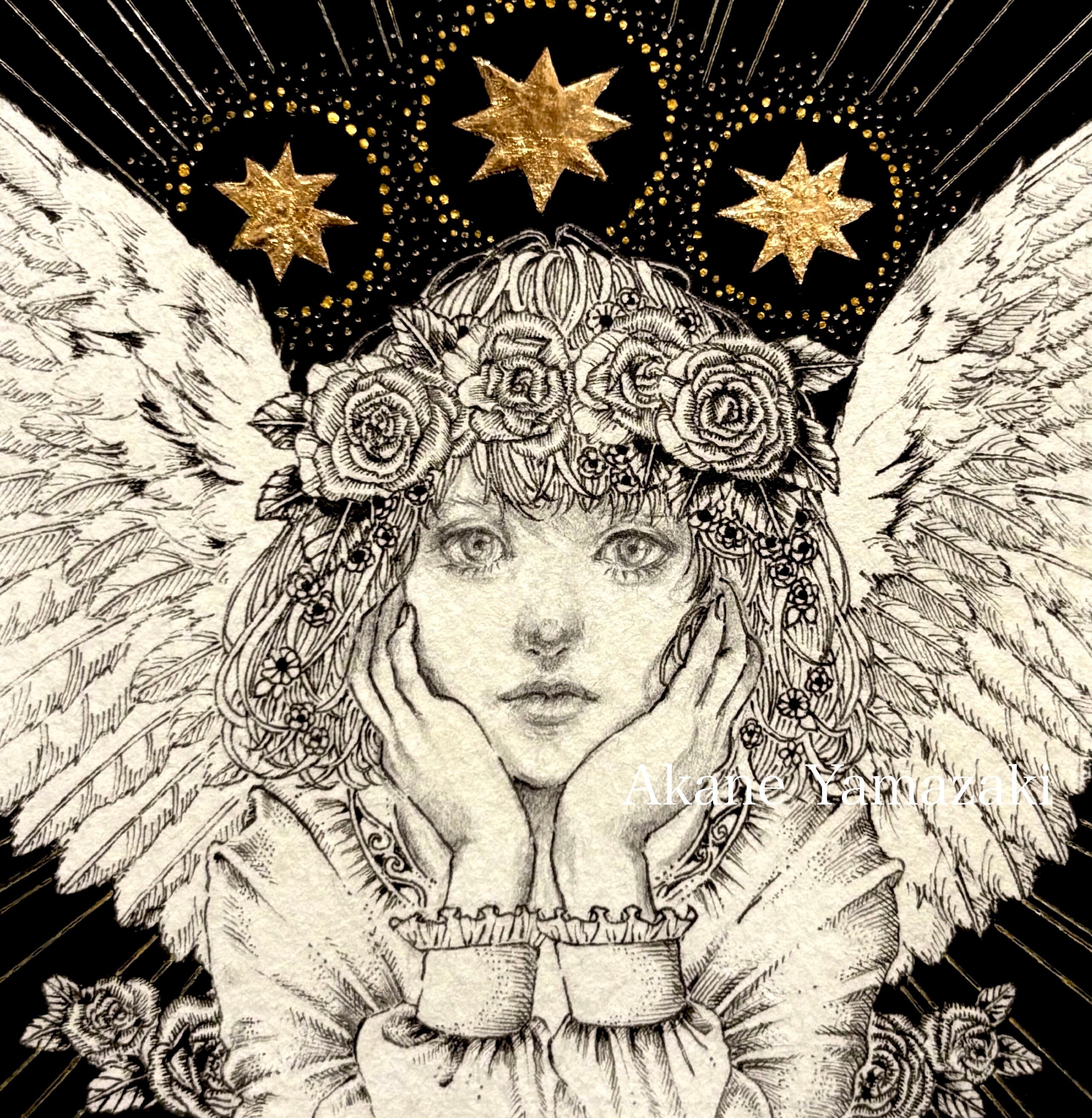 天使をモチーフにした小サイズのペン画です。天使は柔らかい雰囲気を出す事を意識しつつ、画面が小さいので、描写が潰れないように細心の注意を払いながら描きました。クラシカルな雰囲気を出したかったので、紙はコーヒーでうっすらと生成り色に染めています。背景の三ツ星部分は、絵具を塗った上からホイルフレークを箔押ししているので、少し立体感が有ります。