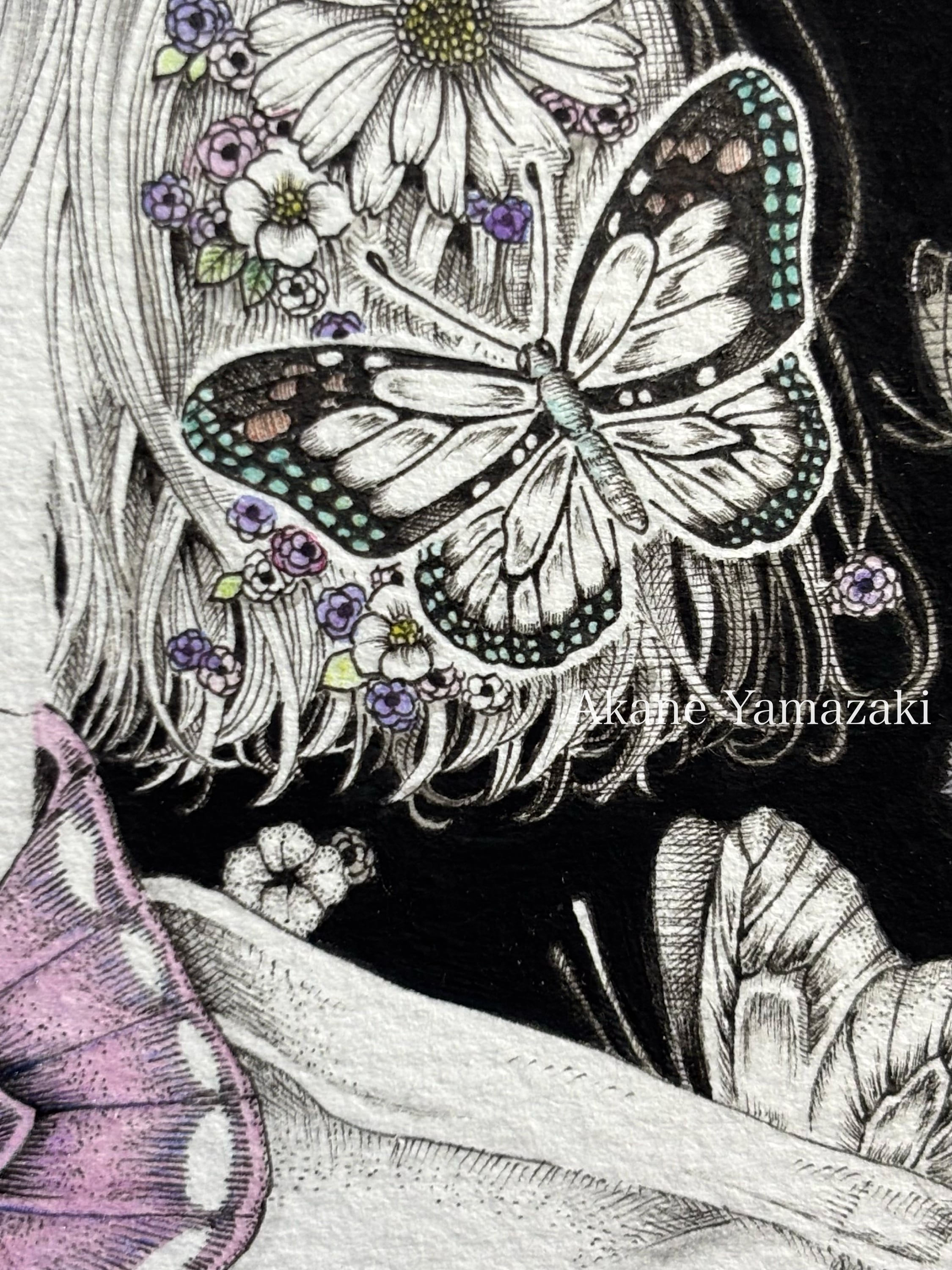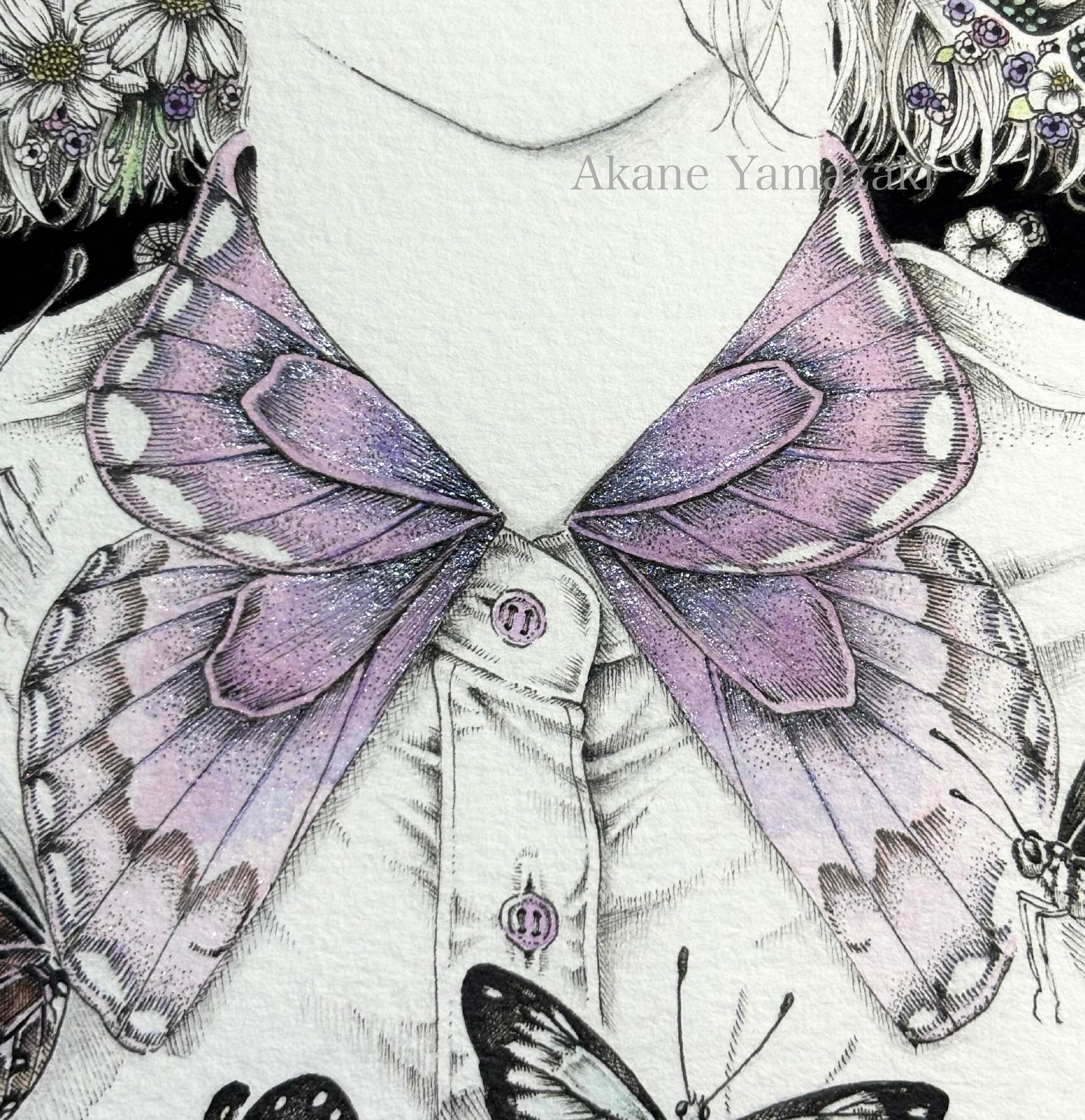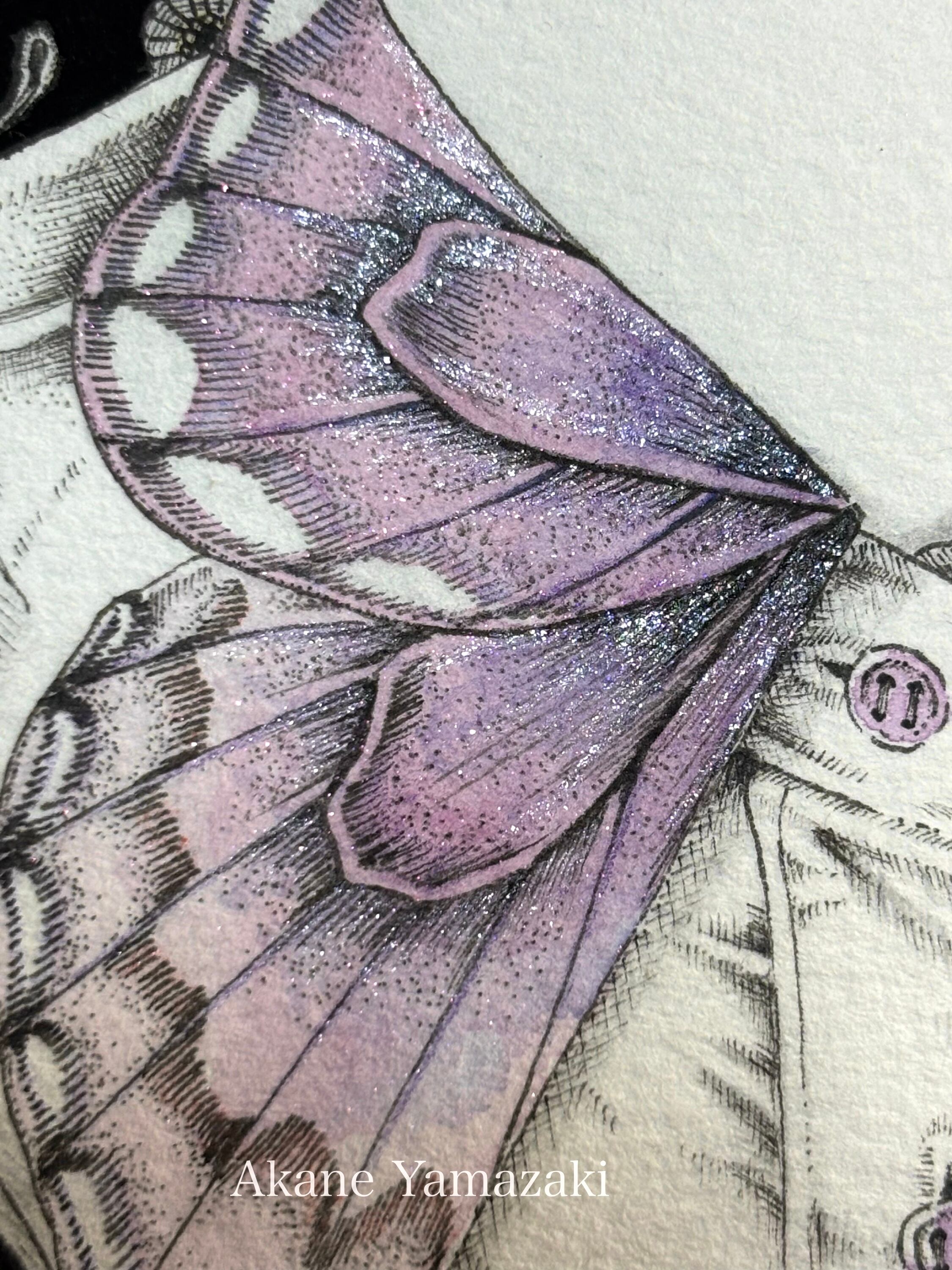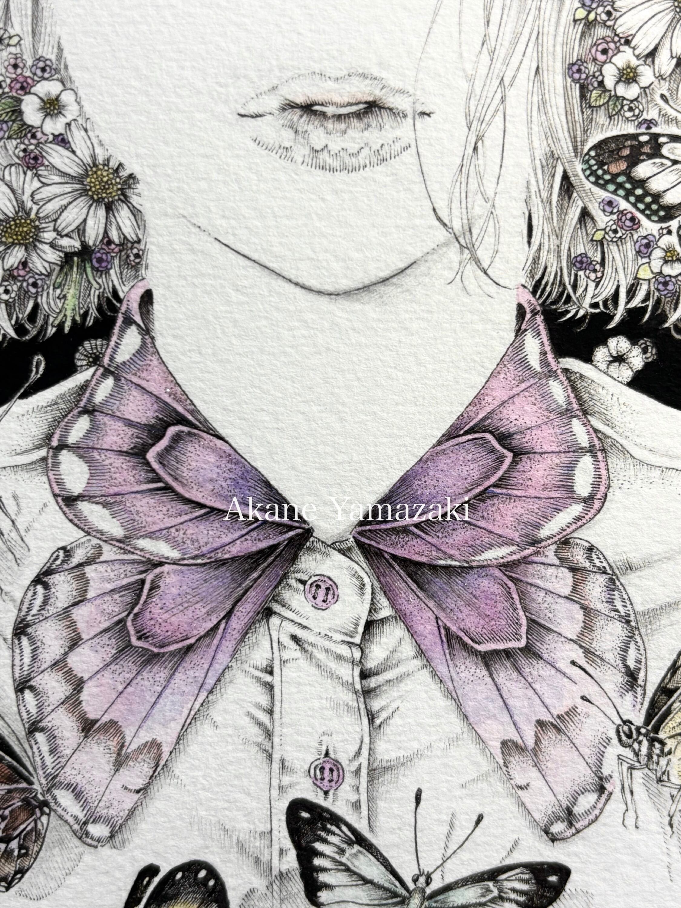 蝶柄の付け襟に誘われるように、蝶達が集まっている様子を描いたペン画です。付け襟を主題にしたかったので、人物の顔は半分見切れるように構図を取り、襟元や髪の毛、唇の描画に注力しました。