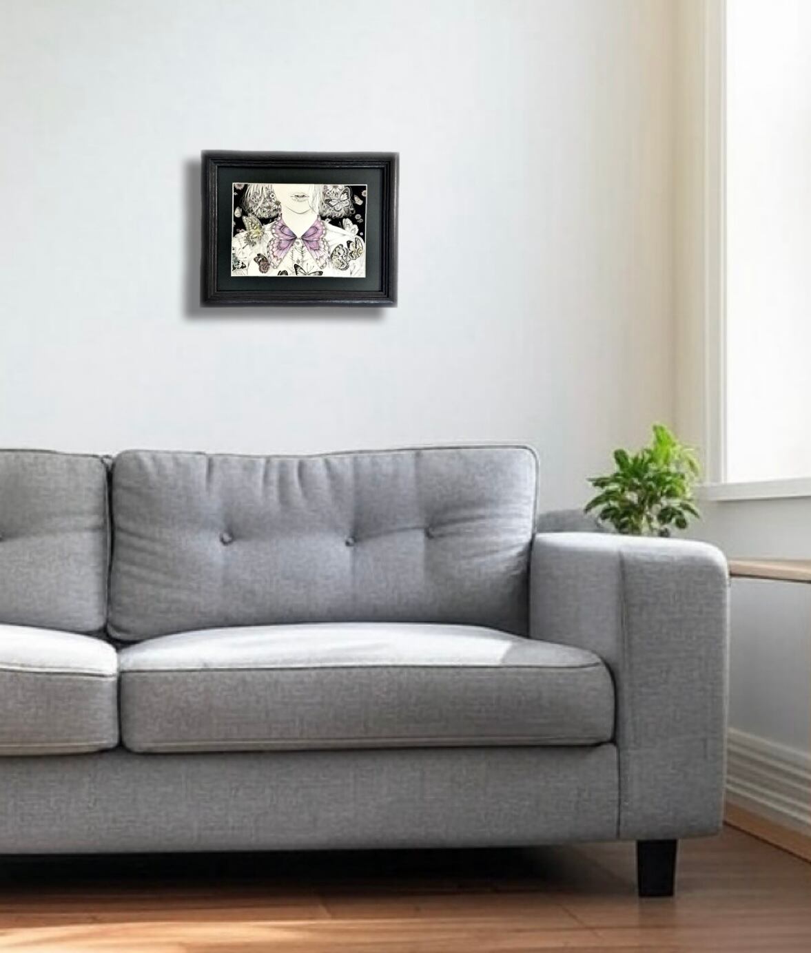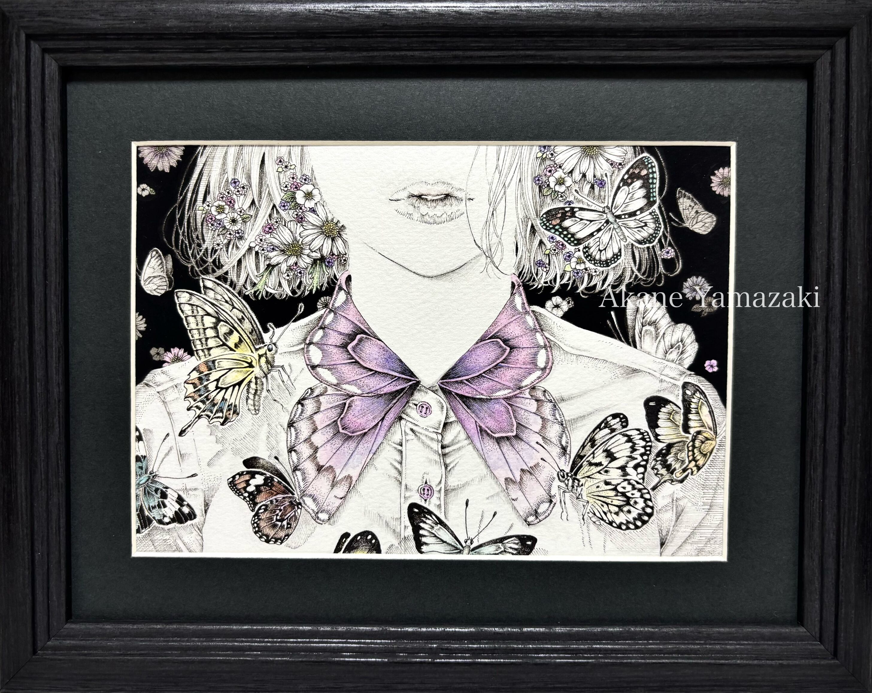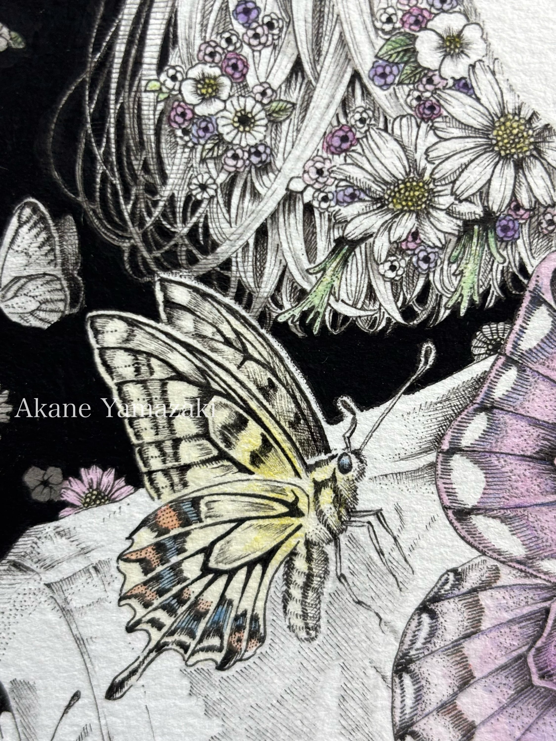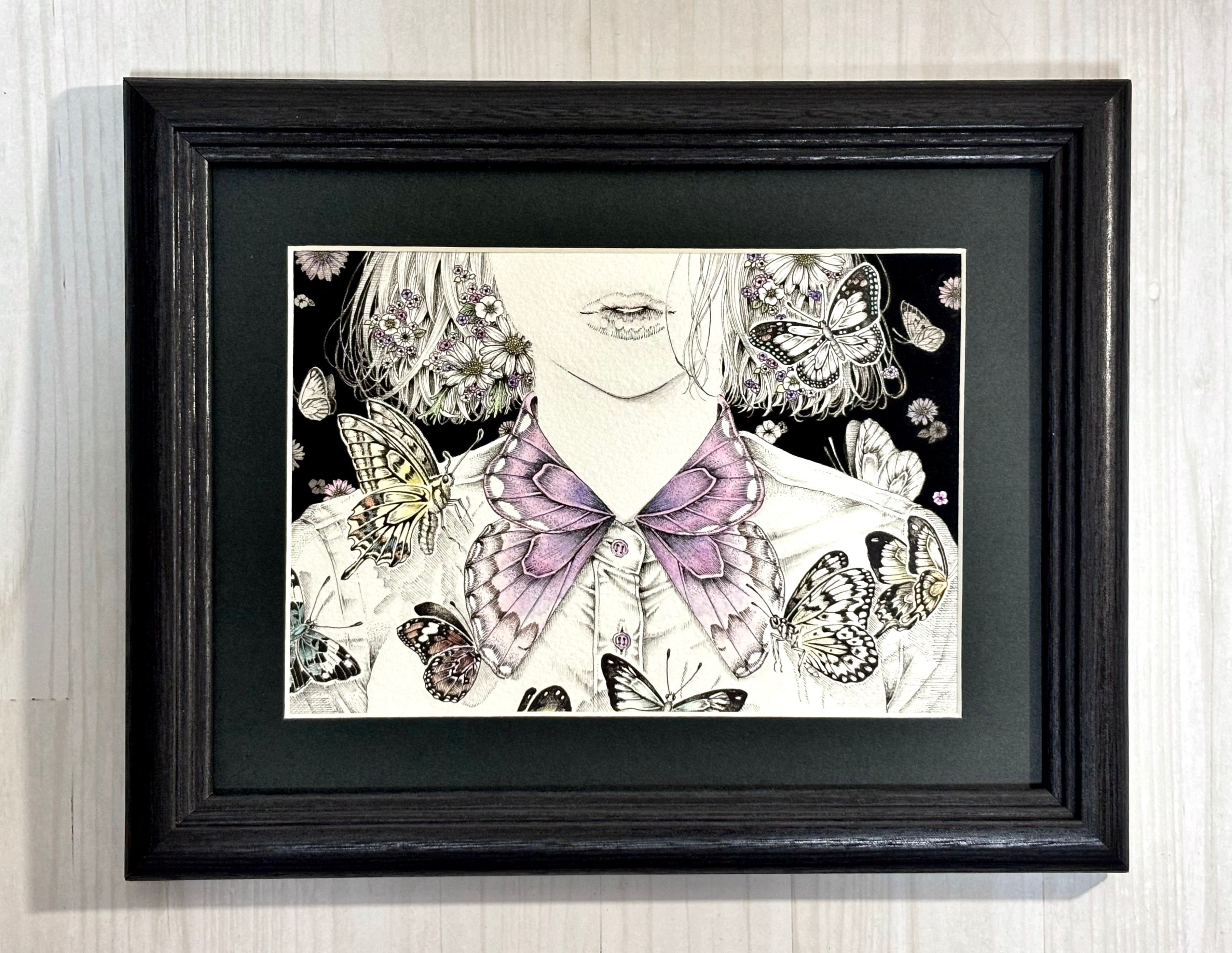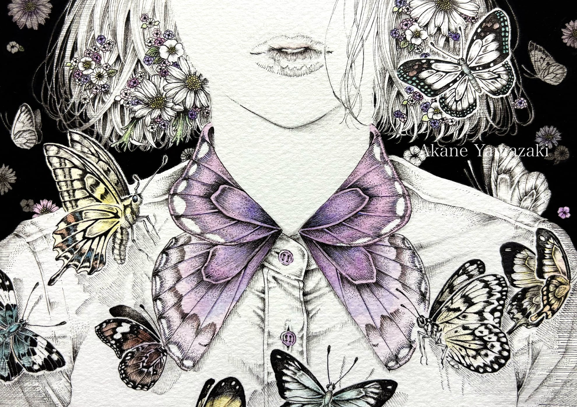 蝶柄の付け襟に誘われるように、蝶達が集まっている様子を描いたペン画です。付け襟を主題にしたかったので、人物の顔は半分見切れるように構図を取り、襟元や髪の毛、唇の描画に注力しました。