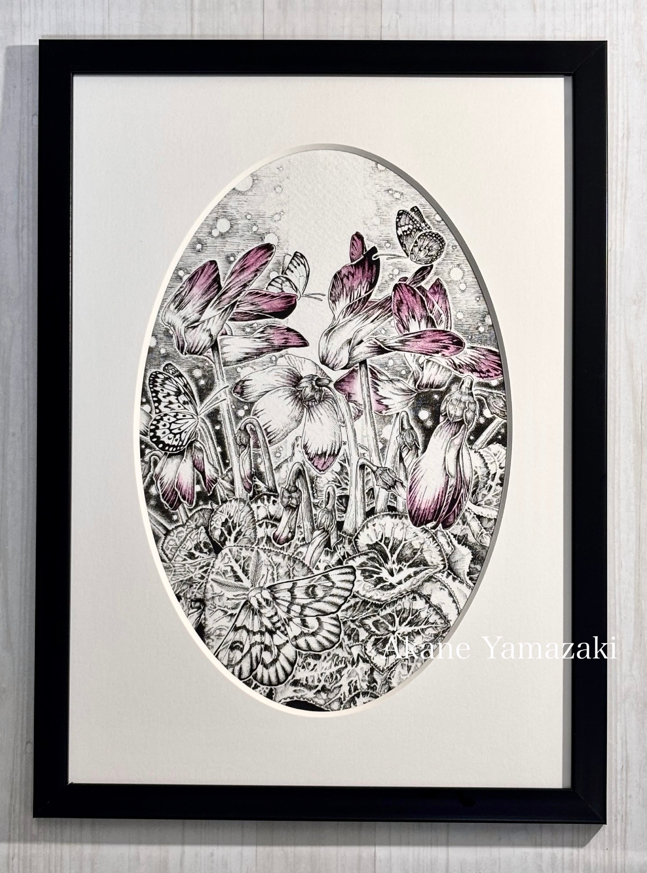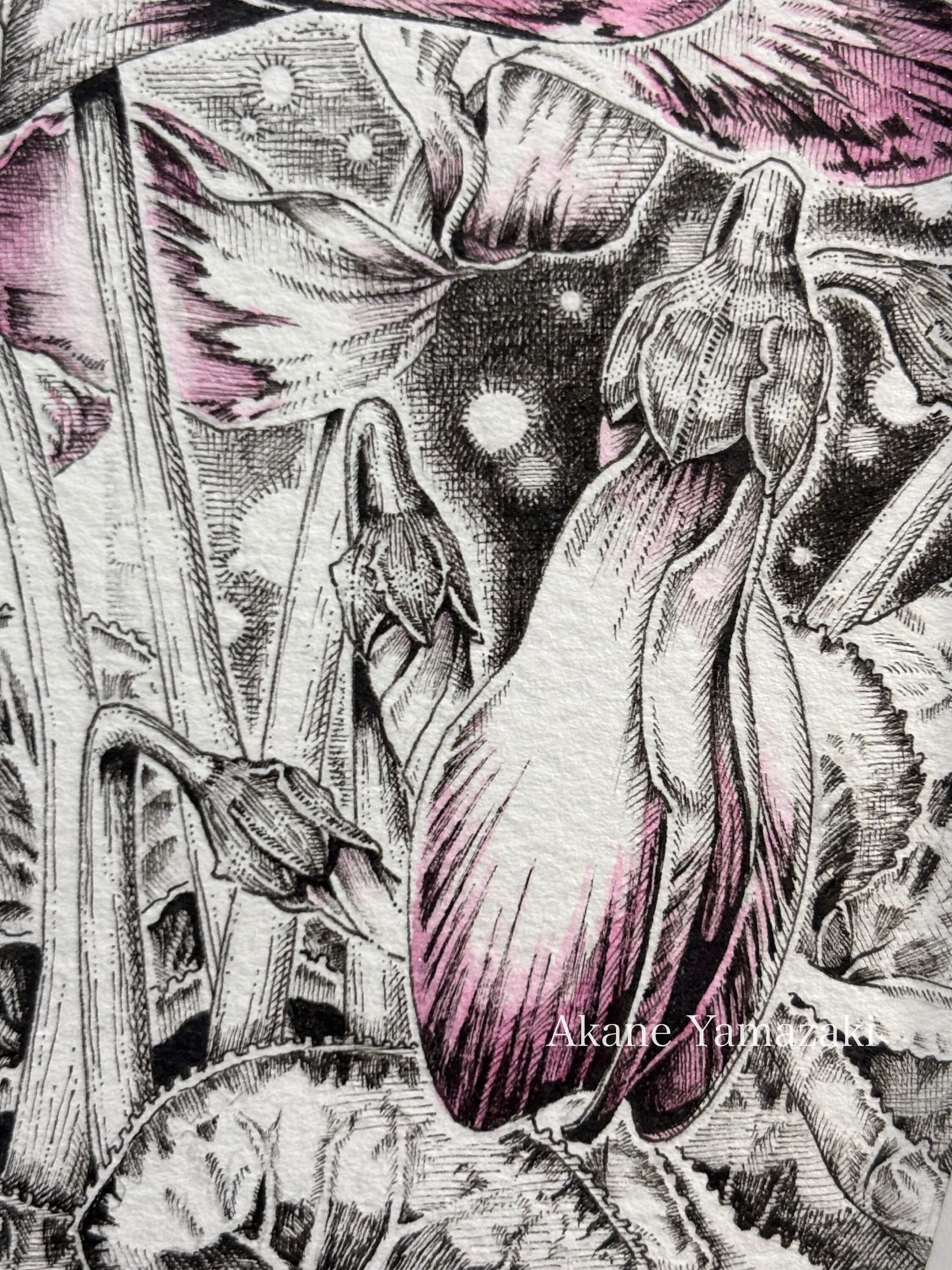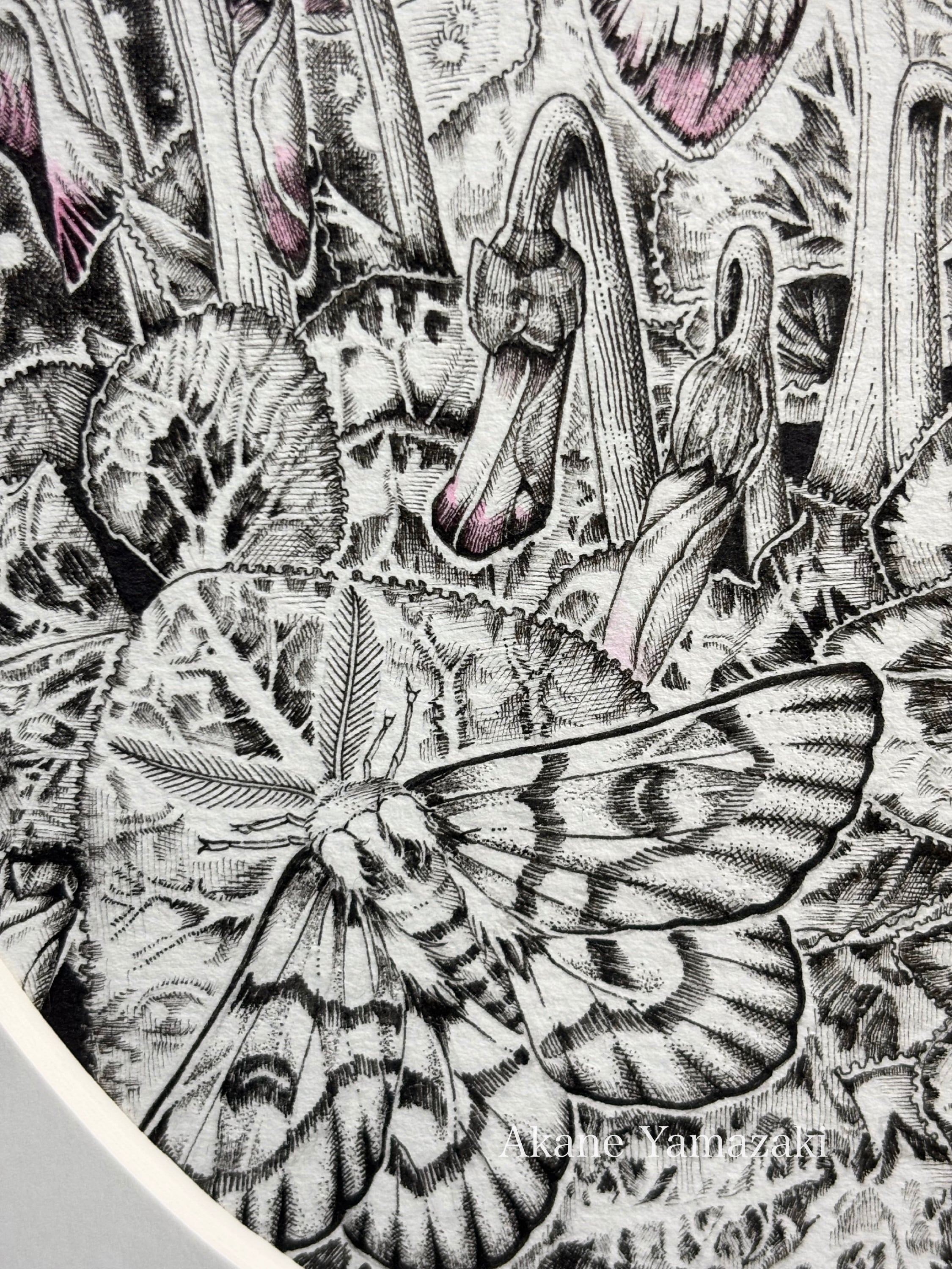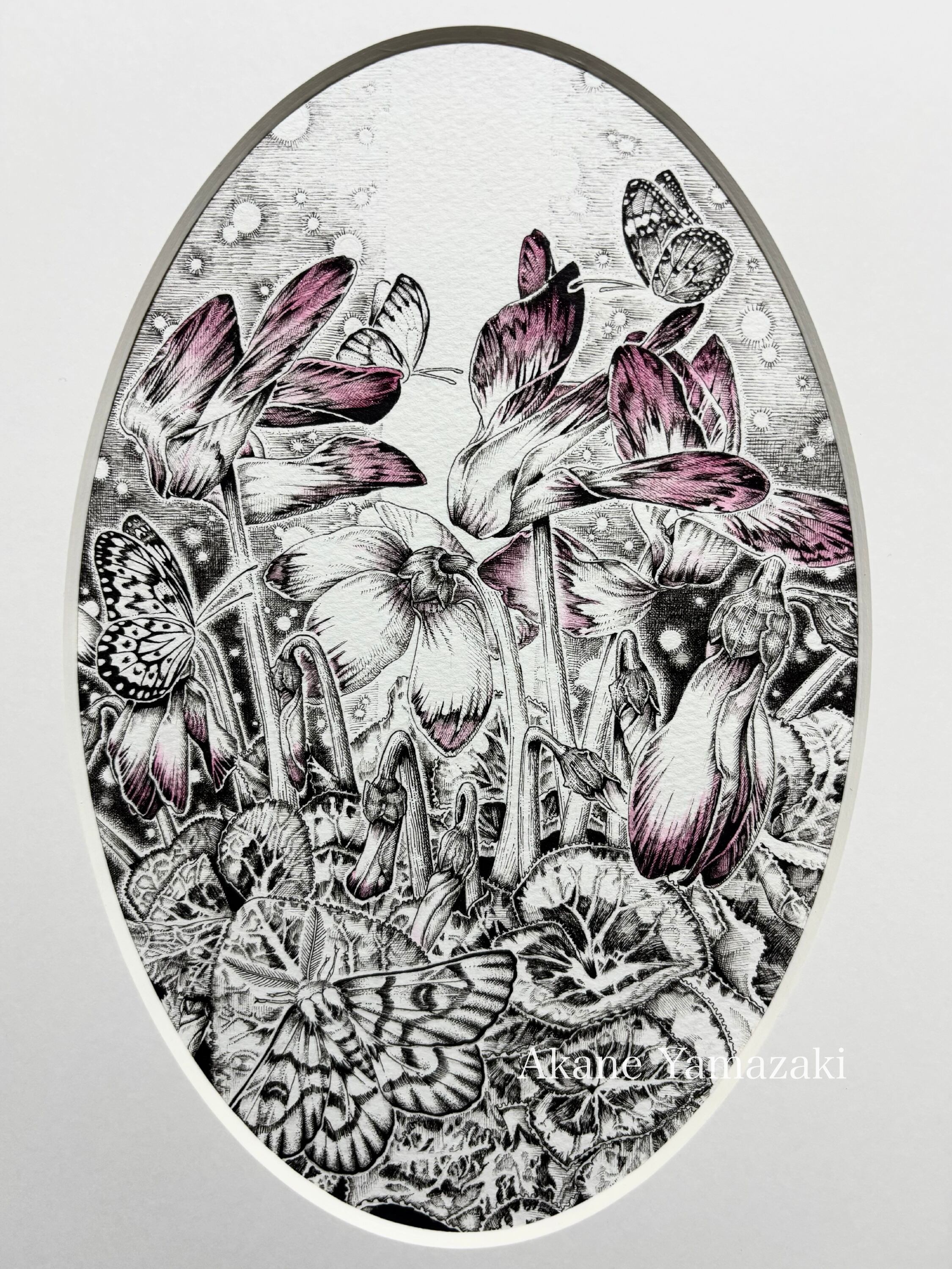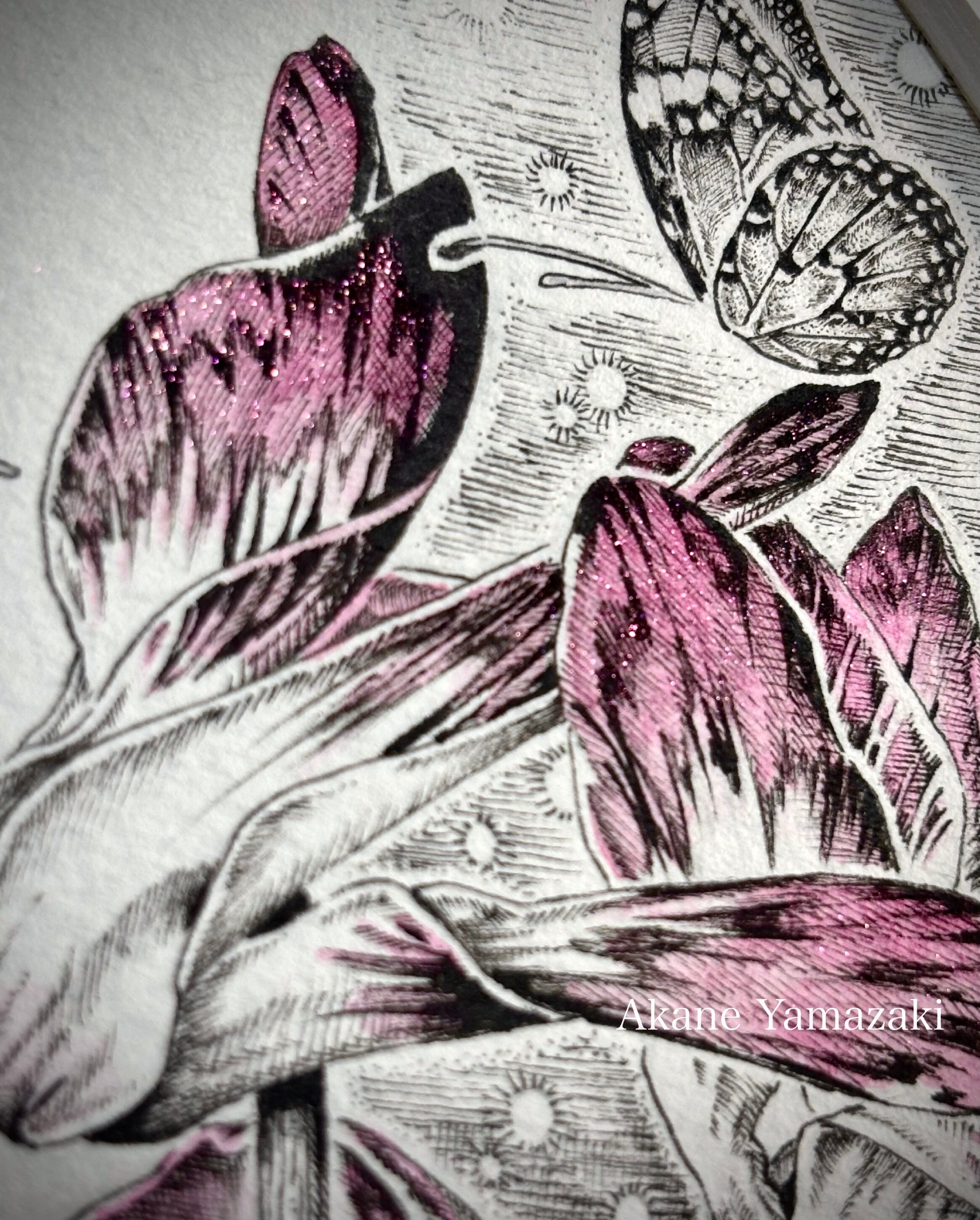 2色刷りの版画のような雰囲気にしたいと思い、丸ペンとミリペンを用いて緻密に描いた後、花弁の色付いた部分のみ透明水彩で着色しました。キラキラとした雰囲気を強調する為、ラメ入りの絵具を部分的に使用しているので、角度によって輝きます。