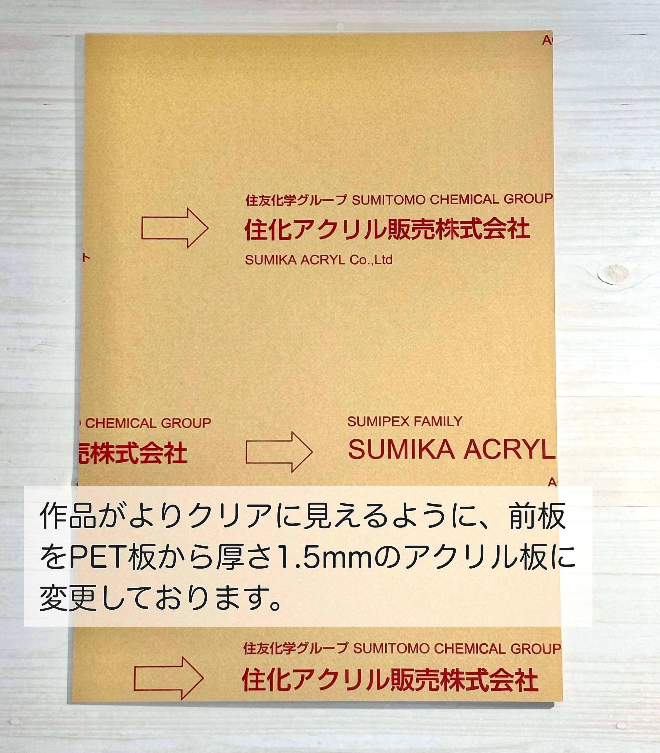 ・三角吊りカンが付いたA4サイズの簡易額縁をお付けしているので、作品ご購入後そのままお部屋に飾る事が可能です。簡易額に元々付いていた面材のPET板を厚さ1.5mmのアクリル板に変更し、作品がよりクリアに見える仕様に変更しております。