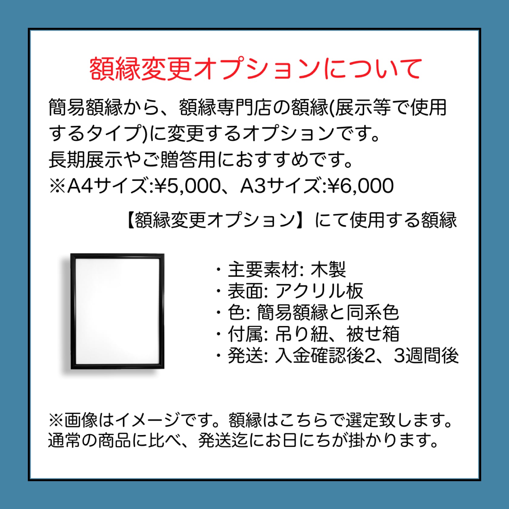 ※【額縁変更オプション】ご選択時は、中身の作品とマットはそのままで、簡易額縁から額縁専門店の額縁に変更させて頂きます。(表面:アクリル板仕様、付属:吊り紐、被せ箱)変更後の額縁外寸は簡易額縁の外寸と、多少異なる場合が御座います。通常の商品よりもお届け迄にお日にちが掛かります。予めご了承下さい。(発送は入金日から2、3週間後の予定です。)